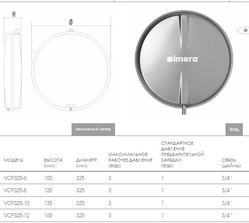 IMERA VCP 325-6 л - плоский расширительный бак (экспанзомат) мембранного типа, предназначен для компенсации изменения объема теплоносителя при нагреве и расширении теплоносителя (воды, или незамерзающих жидкостей) в системах отопления закрытого типа и поддержания в них рабочего давления, но чаще всего применяется в качестве расширительного бака котла.