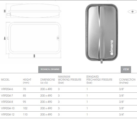 IMERA VRP 250-7 л - плоский прямокутний розширювальний бак (експанзомати) мембранного типу, призначений для компенсації зміни об'єму теплоносія при нагріванні і розширенні теплоносія (води, або незамерзаючих рідин) в системах опалення закритого типу і підтримки в них робочого тиску, але найчастіше застосовується в якості розширювального бака котла.
